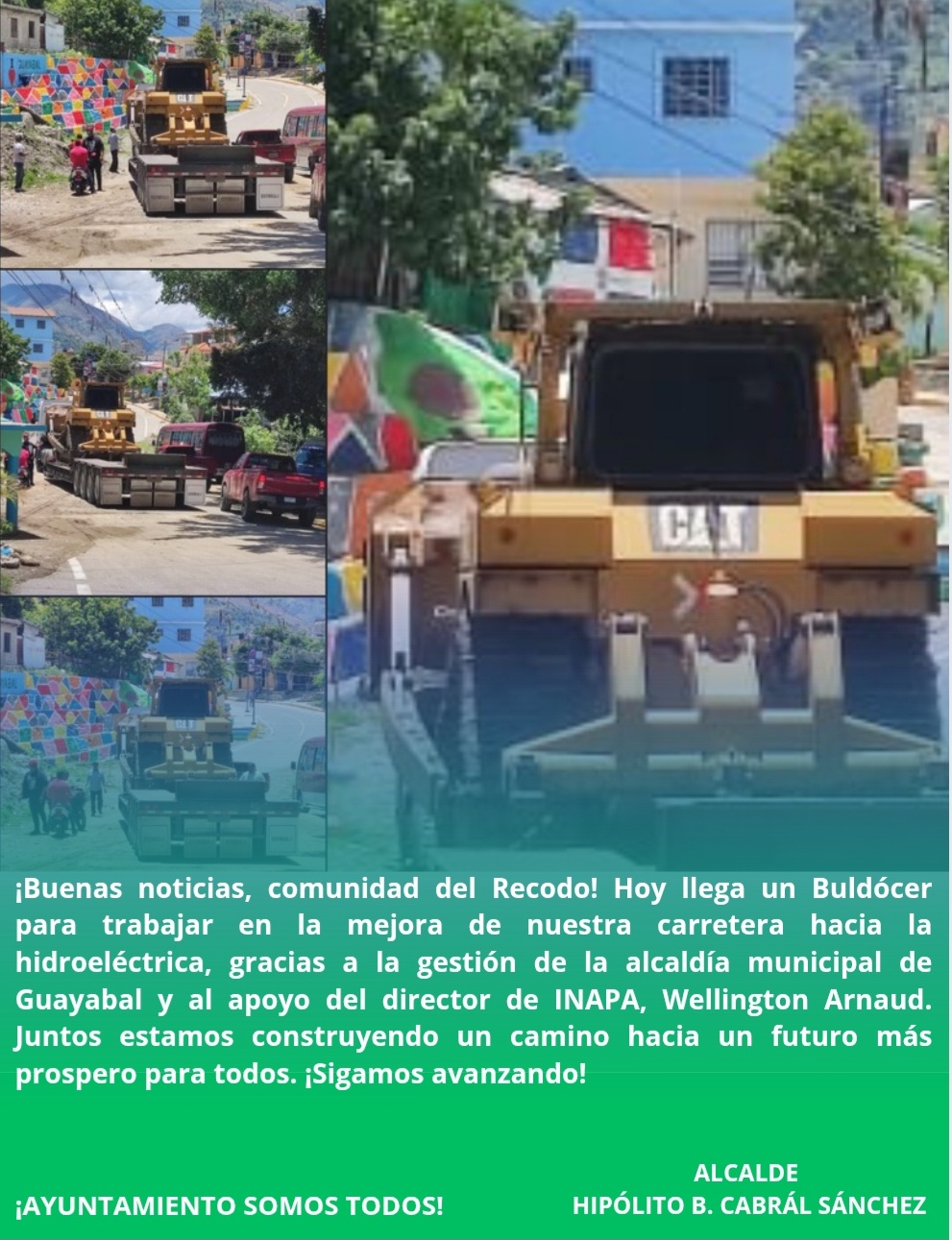 ¡Buenas noticias, comunidad del Recodo! Hoy llega un Buldócer para trabajar en la mejora de nuestra carretera hacia la hidroeléctrica, gracias a la gestión de la alcaldía municipal de Guayabal y al apoyo del director de INAPA, Wellington Arnaud. Juntos estamos construyendo un camino hacia un futuro más prospero para todos. ¡Sigamos avanzando!