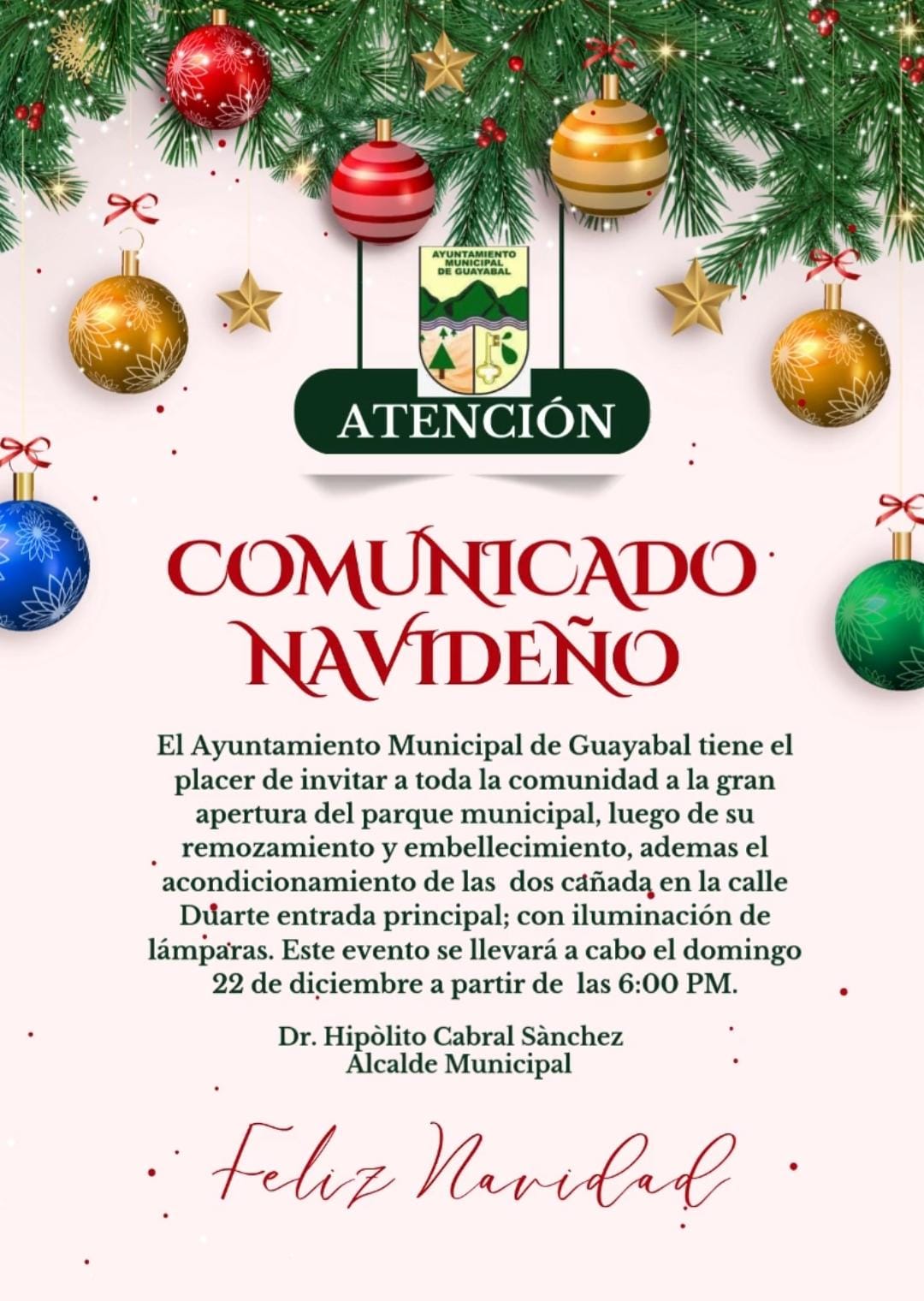 La Navidad es una época mágica y especial para compartir momentos inolvidables con familiares, amigos y seres queridos. Por eso, el Ayuntamiento Municipal de Guayabal tiene el placer de invitarles a disfrutar de una serie de actividades programadas que llenarán nuestras fiestas de alegría y unión.