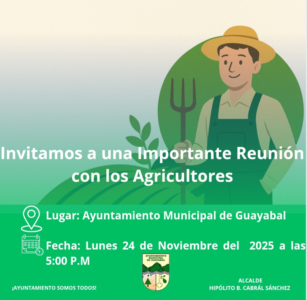 Invitamos a una importante reunión de trabajo a todos los agricultores y asociaciones agrícolas del municipio de Guayabal, encabezada por el alcalde municipal, Dr. Hipólito Cabral, y el Consejo de Regidores.